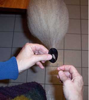 You then pull the fiber back about a staple length, and then reach forward next to the diz and repeat: