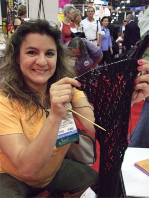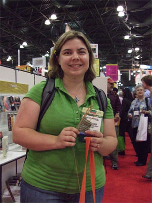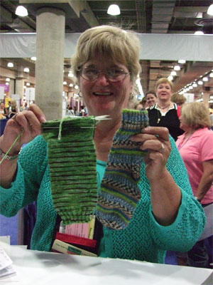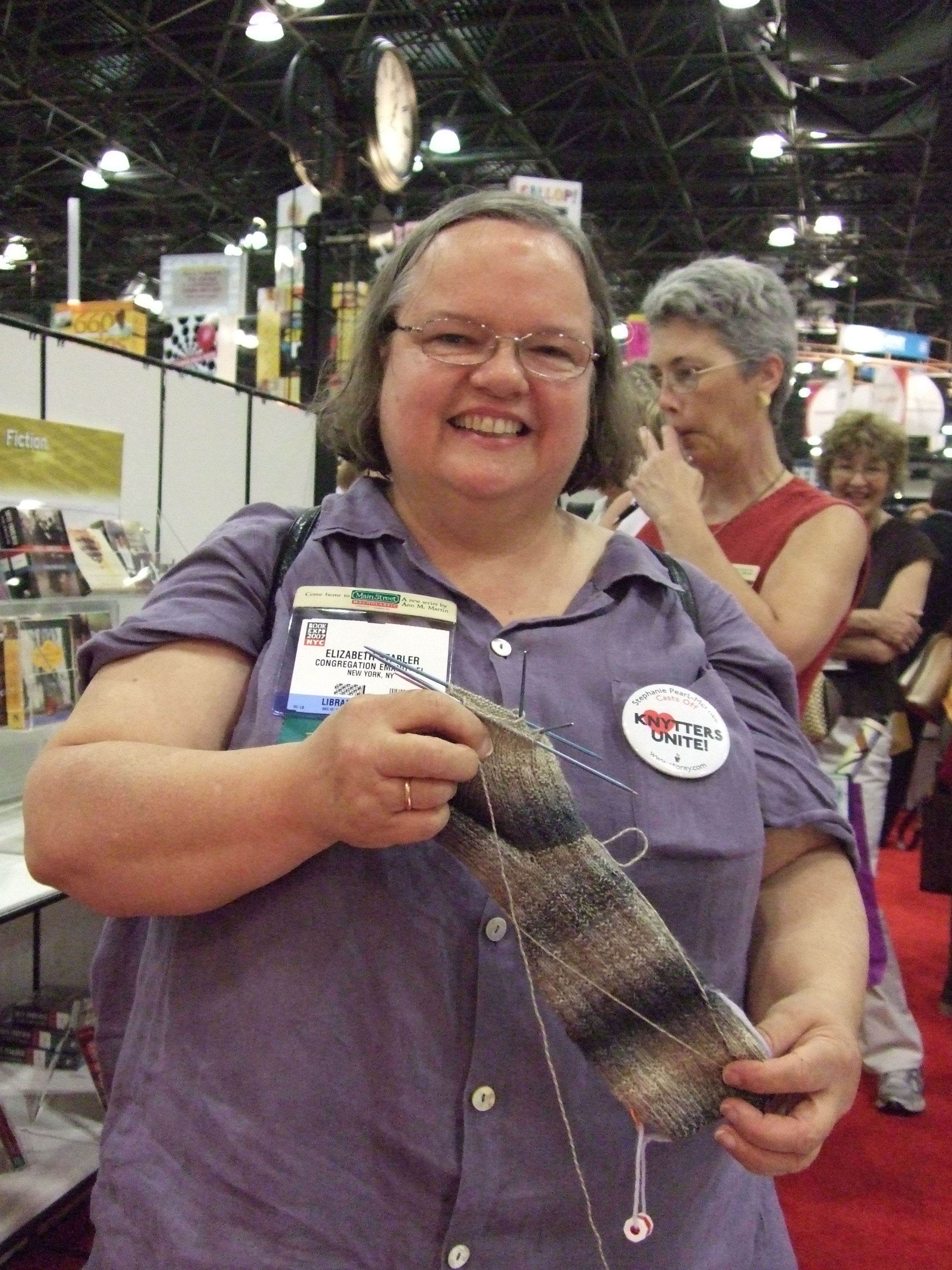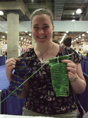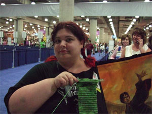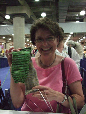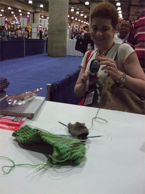 5. I went to BEA. BEA is pretty darned weird all by itself, and if you aren't freaked out when you get there, you are going to be seriously flipped when you leave. Lucky for me, I had been pretty shaken before I got there, so I just rolled with the weird. BEA is an industry tradeshow for publishing, and you can't go unless you are involved with it somehow. Authors, publishers, booksellers, librarians...you get it. You can't just walk in off the street. This makes it very difficult for your average Yarn Harlot to stack the place with knitters...but I managed. Here, in quick order and click 'em if you want em big, are the random knitters I found at BEA.
