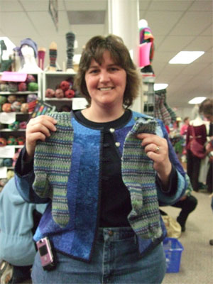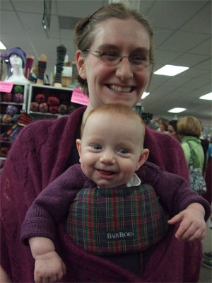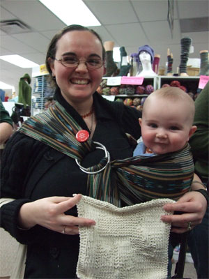 Amy won a skein of sock yarn from me, and she's turning it into a little sweater (there's a baby under there.)