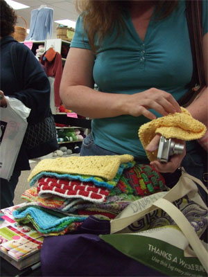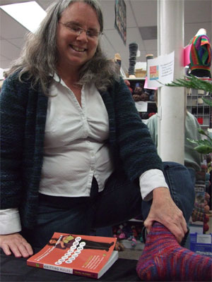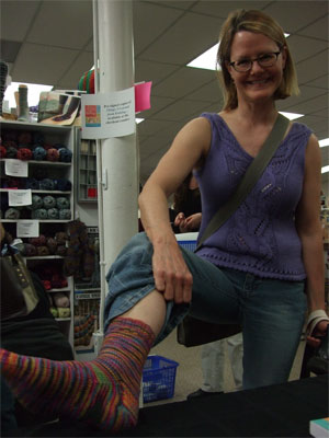 This morning, all I can think is that Steve and Kathy at WEBS are the smartest things ever. They had a thousand (maybe more) knitters turn up yesterday, and I didn't catch either one of them crying in the bathroom from the strain of it all. (Kathy and I did have a matched set of stomach cramps though. Stress.) Steve directed traffic in the parking lot, Kathy wrote names on post-it notes so I could spend time with knitters that didn't include asking them how to spell names, and they experimented with a "pre-event signing" from 11-1 that, while it worked well, just about killed me. (I am still not so sure what is so tiring about this job. Meet knitters. How hard can that be?) There was a scary and totally weird moment on stage when I felt a little faint (of course. That's never happened before but it just has to happen in front of a thousand people) where I felt sure I was going down and all I could feel was a terrible certainty that if I did faint, a thousand knitters were going to A) blog it and B) pose socks on my fallen form.) Kimberly (my favourite stalker) saved me with a bottle of water and I felt better almost instantly....as you might have guessed from the lack of reports that I went down like a house of cards. Totally bizarre. I blame fear...because this is what it looked like.