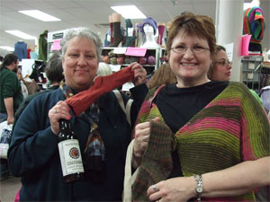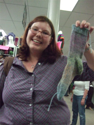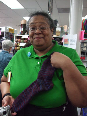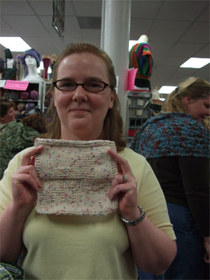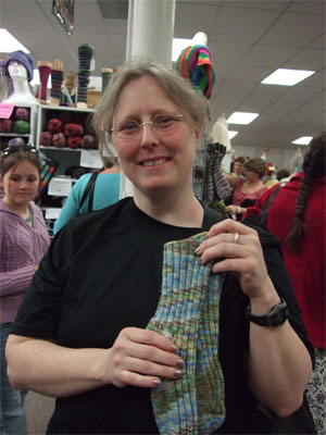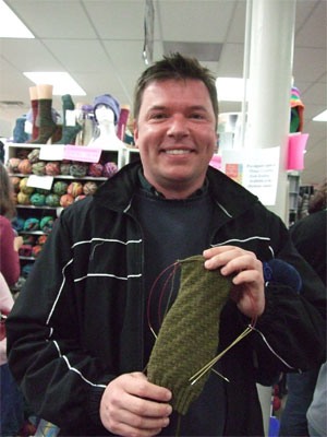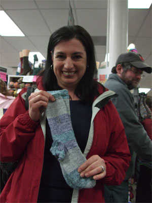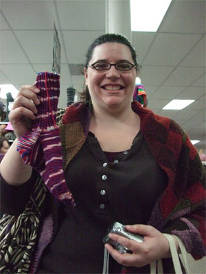 Meet Noelle, Nancy, Lynn, Chris and Carol (brought me a beer that was my best friend later that night) Chris, Alex, Maria, Cheryl, Dennis, Stacy, Lucille, Dianne, Carolyn, Dan (who has only been knitting for three weeks and had a perfect sock) Jennifer, Louise, MargoLynn (she had a monkey too) Cori, Rebecca and Angela. (Whew. As always, Click to embiggen.)
