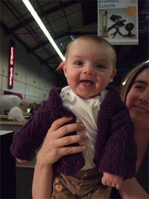 They were easier to see afterwards. Knitters came (of course) with babies and little kids, since this was family/kid heaven. Meet Cindy and Zoe (she's wearing a fabulous sweater), Elizabeth and Nathan (Nathan is showing me his monkey that his mama made for him at sock camp. The pattern for the monkey is up and available here.) Michelle and Katherine, Kimber and Sarah, Anabel and Freya. There was a young knitter too, Kelsey, but she was a very pretty 12 years old, and 12 years old isn't old enough to understand bad pictures of yourself on the internet. The photo I took was nowhere near as lovely as she was, so I skipped it.