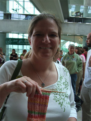 There were knitters with babies, like Angela and her sweetie (can't read my handwriting...is it Lira?) and Rachel, who brought pictures of her twin babies. (She pumped for the occasion. I bet that took a little pre-planning.)