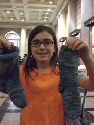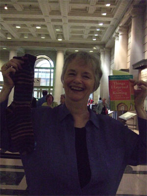 It was actually sort of fun to watch, which is always is when knitters mix with the non-knitting in droves. The talk was in this space, but the signing was upstairs in a hall, and as knitters do have a flocking instinct, they gathered en masse. I can't be the only knitter there who loved people wandering by and looking at us and trying to figure out what was going on. Here's what was going on. Knitters filling the lobby, hoisting socks aloft, taking pictures, showing each other sweaters and shawls, publicly squeezing balls and skeins...we were inexplicable in the face of the rest of the book fair. Young knitters, William (11) and Diana, who was double qualifying at 9 years of age by also bringing her first socks, and Brianna, who showed up without her sidekick Leah.