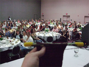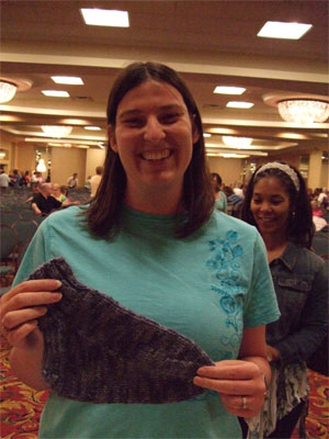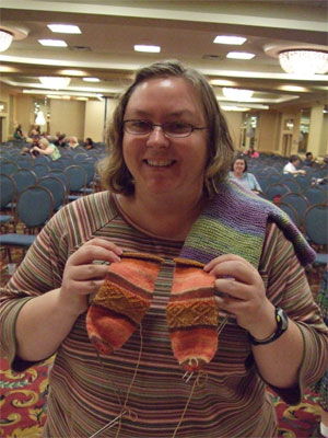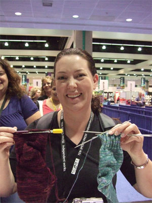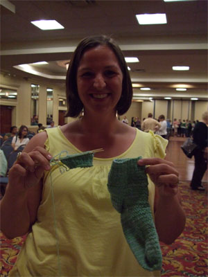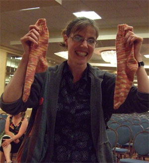 More people could have held the sock, but lo the knitter was occupied by her duties and by the very enormous amount of yarn around that distracted and befuddled her. (Seriously, the knitter just about took leave of her senses when she saw the new Louet yarn. The knitter is a yarn person of some immunity. Repeated exposures to yarns of all kinds have left her with the ability to resist it's magical incantations and auras, but this yarn was devastating. There doesn't seem to be a link to it online anywhere, thus confirming that it is of dark origins, but it was some mohair/ bamboo/ bison action that was fuzzy and reflective and shadowy and bright and truly a mystic thing. Many knitters stood in it's thrall. (What the hell was it called?) The TNNA magic went on and on, and the knitter talked to many interesting and powerful yarn people, and she drank more of the magic beer. (Not too much though. It is very important not to be impaired around either knitters with highspeed and cameras, or people who are trying to wholesale mass shipments of yarn. I'm sure you can see the risk of both.)