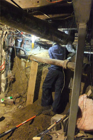 It isn't now. Joe called in the reserves (like Pato, what a good boy) and started to dig a trench through the top layer of the crawlspace, and hauled dirt onto the basement floor, then bagged it up, then it was carried by me and Ken (ok. Mostly Ken) to the backyard... where... where I'll have to figure out how you make it go away. Work can now proceed on the furnace on schedule tomorrow morning, and for a little while there, the tears had stopped. (Let's not discuss the mud/dirt slurry in the basement. I'll figure that out later.)
