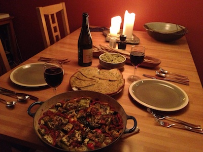 Joe set about learning. He got some recipes, and he started trying. The first few weeks were nuts. Joe made a fabulous black bean espresso chili. It was delicious, but it took him about ten hours, and the kitchen looked like he'd been fending off a pack of wild dogs while stirring. Then one night day he made tian and socca, and made breadsticks. From scratch! Yes, it took about nine hours, but he's new.